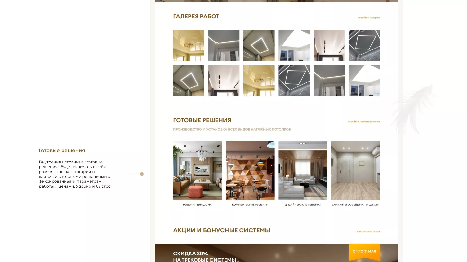 Что мы сделали. Разработали сайт в теплых и уютных «шоколадных» тонах. Продумали структуру, наполнили ее удобными разделами такими как «готовые решения», которые включают в себя не только уже готовые варианты с фиксированной ценой, но и разделение по категориям: решения для дома, коммерческих помещений, интересные дизайнерские решения. Так же предложили клиенту онлайн-калькулятор, что может существенно упростить потенциальным заказчикам нашего клиента в Ишимбае заказ потолков.